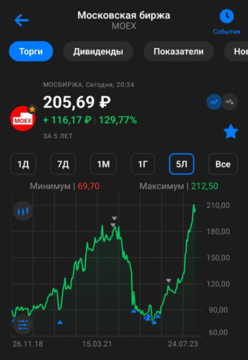В течение 2023 года акции Мосбиржи выросли почти в 2 раза. Но последние полгода рост замедлился, акции находятся в боковике. На данный момент котировки находятся вблизи исторических максимумов.