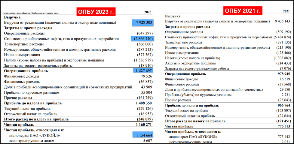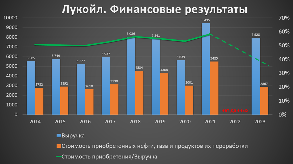 Как же так получилось, что при значительном падении выручки, так существенно выросла прибыль. Разумеется, всё дело в затратах и расходах. Причём, несмотря на падение выручки, в 2023 году выросли все расходы кроме одной статьи. Это стоимость нефти, газа и нефтепродуктов, которые Лукойл приобретает у совместных и ассоциированных компаний для переработки и последующей продажи. По этой статье компания затратила на 2,6 трлн меньше, чем в 2021 году.
