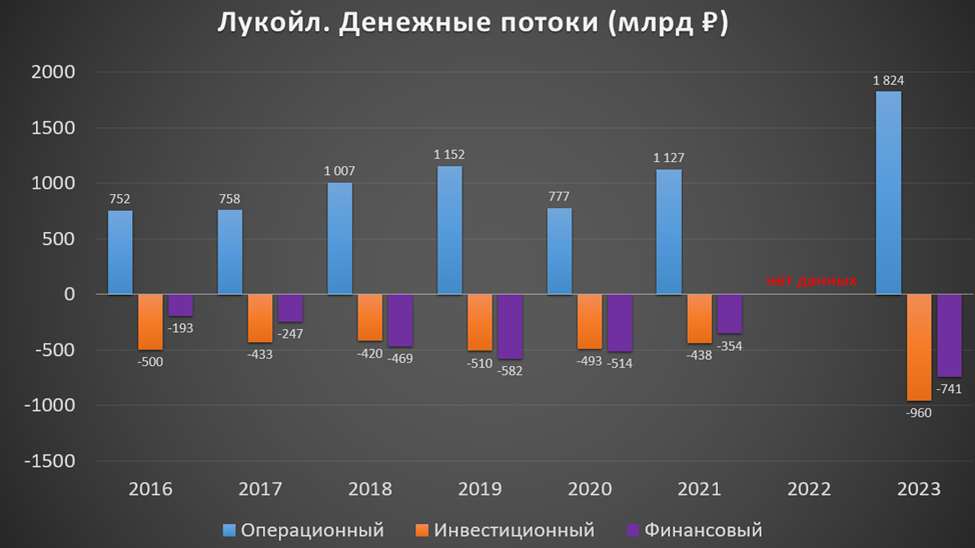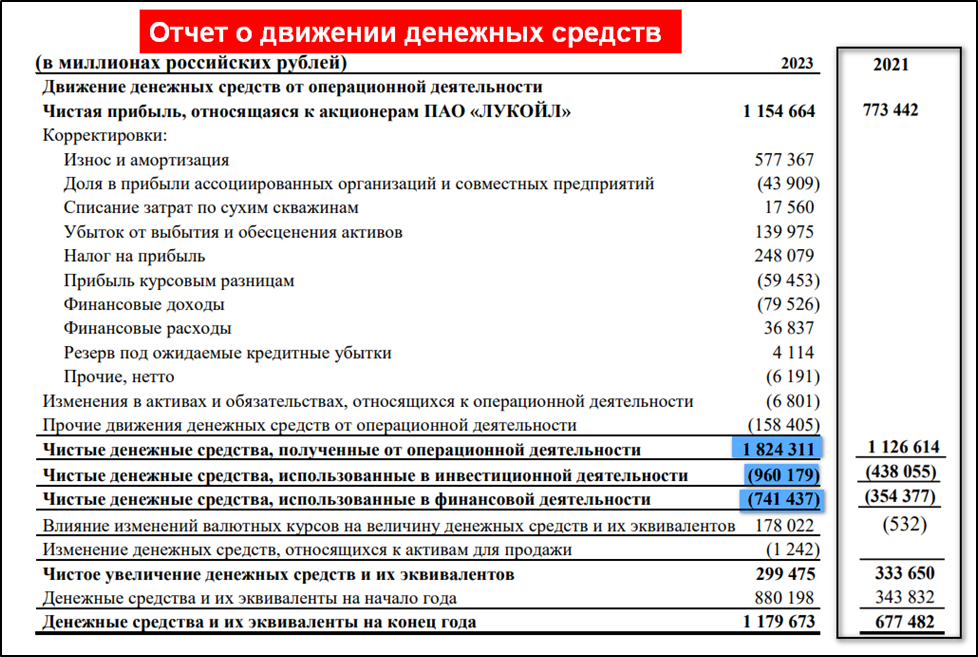 от операционной деятельности: 1,8 трлн. Именно столько денег поступило в компанию за год. Это в 1,5 раза больше, чем в 2021 году. Основная причина – это рост чистой прибыли.