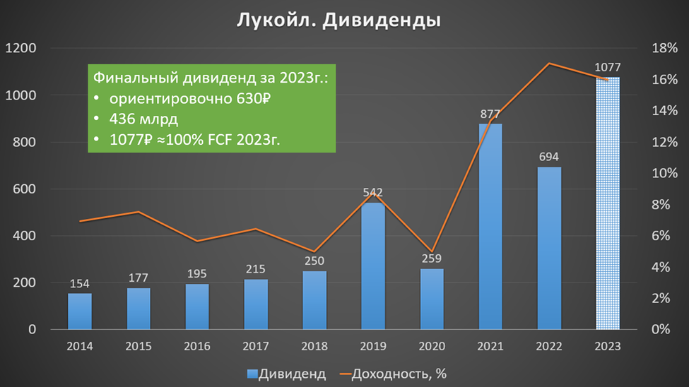 В конце прошлого года Лукойл выплатил промежуточные дивиденды 447₽ на акцию. Финальные дивиденды могут составить ориентировочно 630₽. Таким образом итоговые суммарные дивиденды могут превысить 1000₽. Это более 14% доходности к текущей цене акции.
