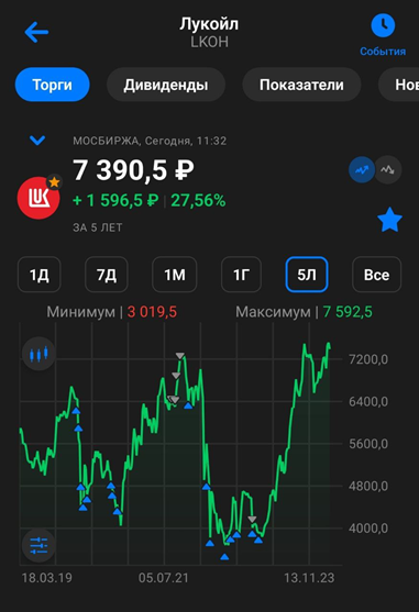 Как видно на графике, в 2021 году я зафиксировал отличную прибыль. После этого начал заново формировать позицию. Текущая средняя цена покупки около 4500₽. К слову, о всех своих сделках пишу в нашем телеграм канале. На данный момент доля Лукойла в моём портфеле акций более 7%. Позиция плюсует на 65%, это не считая дивидендов. Но пока продавать не планирую.