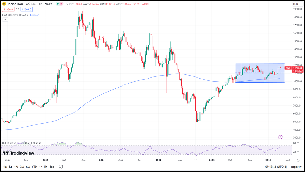 После окончания частичной мобилизации, акции выросли более, чем в 2 раза. Рост за 2023 год составил 38%. Но с лета 2023 года котировки находятся в боковике.