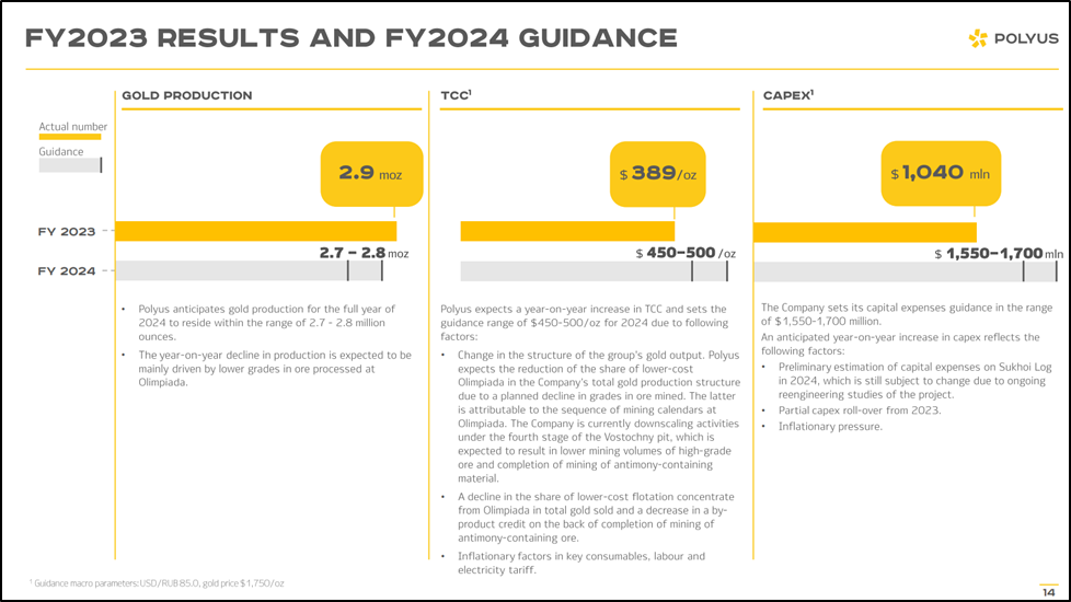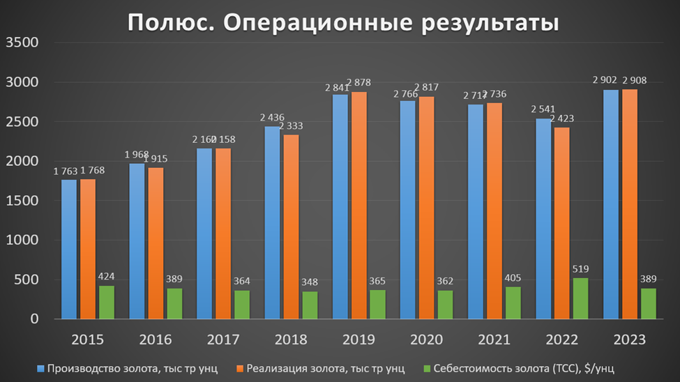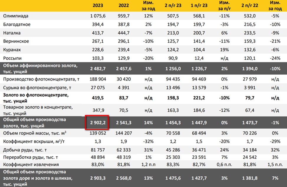Общий объем производства вырос на 14% г/г. На примере Олимпиады видим, что это произошло благодаря увеличению интенсификации горных работ на участках карьеров с более богатой рудой. А в 2022 году из-за геополитической неопределённости компания наоборот сознательно снижала добычу золота, сосредоточив работы на карьерах с менее богатой рудой.