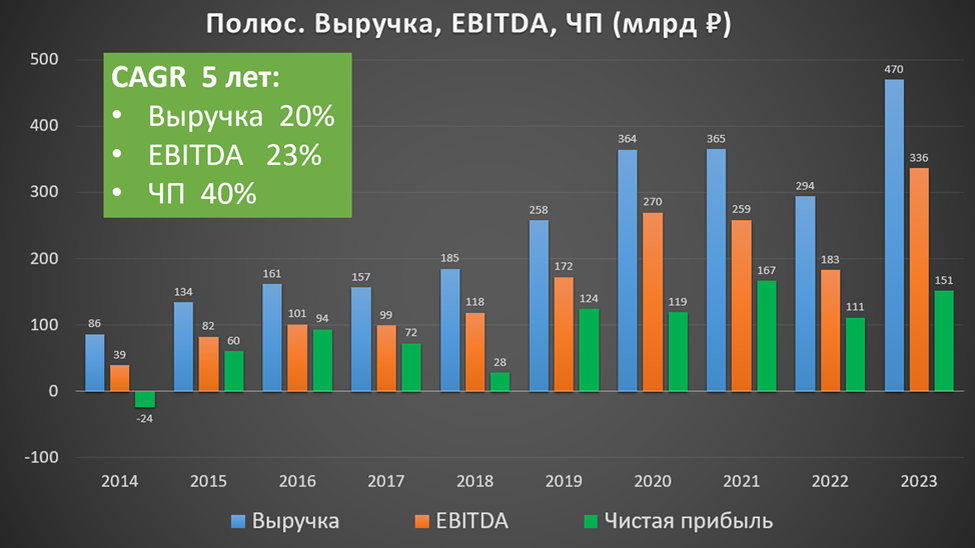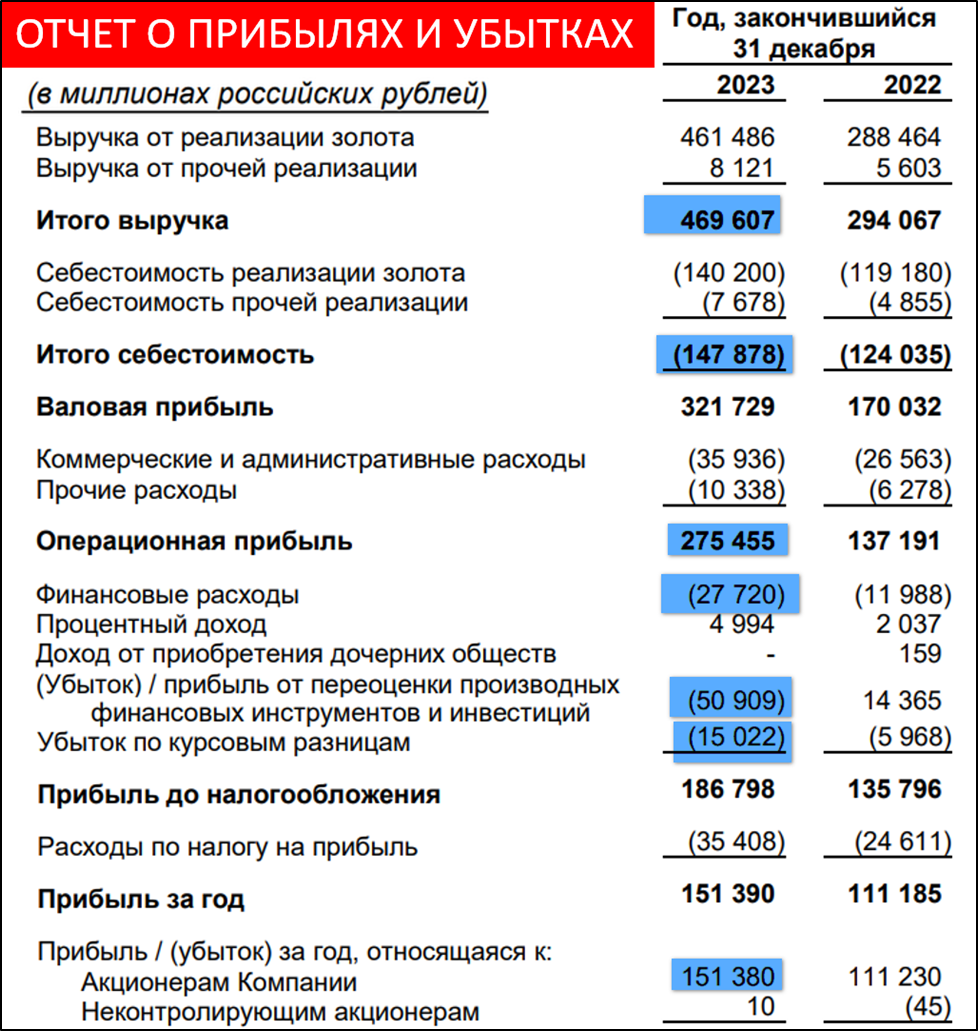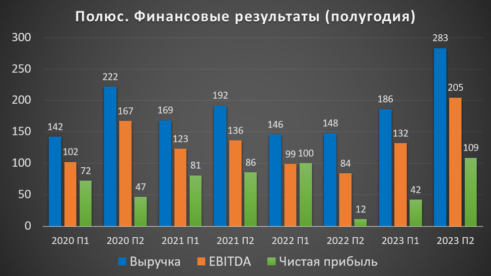 Позитивный результат был достигнут в основном во втором полугодии, который оказался в 1,5 раза лучше первого. Так получилось из-за того, что в 2П 2023 было продано на треть больше золота. К слову, это традиционная ситуация для Полюса.