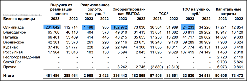50% выручки и 54% EBITDA приходится на Олимпиаду. Также на него приходится 51% реализации золота. Денежные расходы на производство золота на этом месторождении минимальны. На Благодатное и Наталку приходится примерно по 14% выручки и EBITDA.