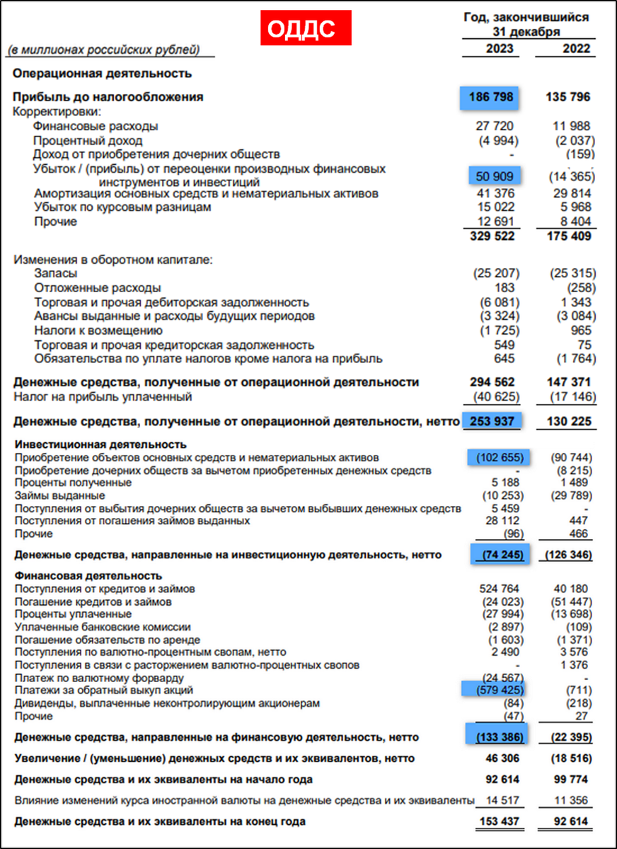 операционная деятельность 254 млрд (+95% г/г). Именно столько денег поступило в компанию за полгода. Такой существенный рост благодаря росту прибыли и бумажным переоценкам от производных финансовых инструментов