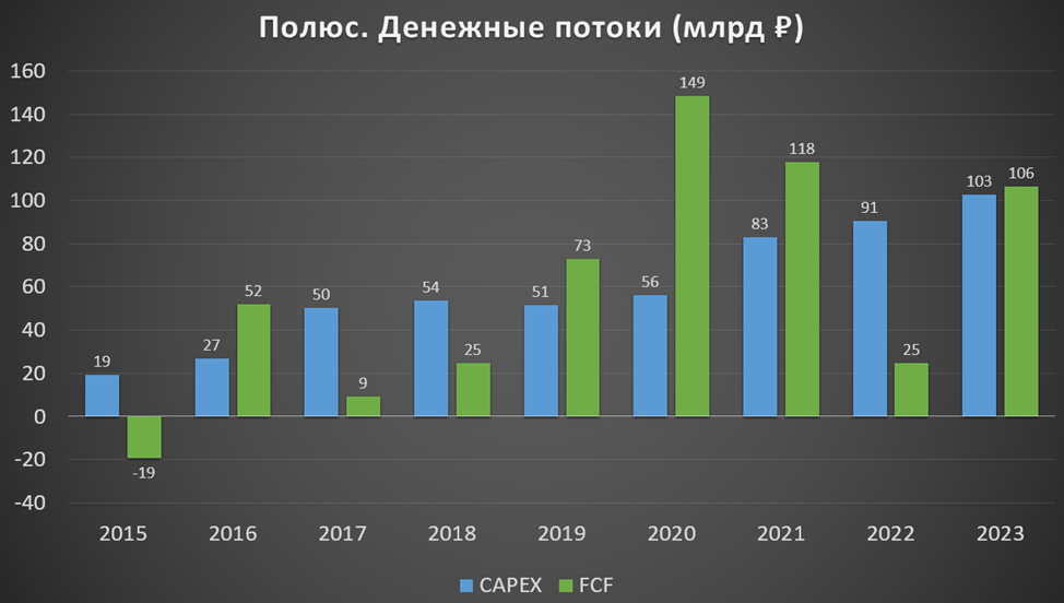 Свободный денежный поток, несмотря на рекордный капекс, также на довольно высоких отметках.