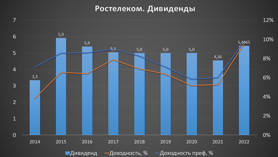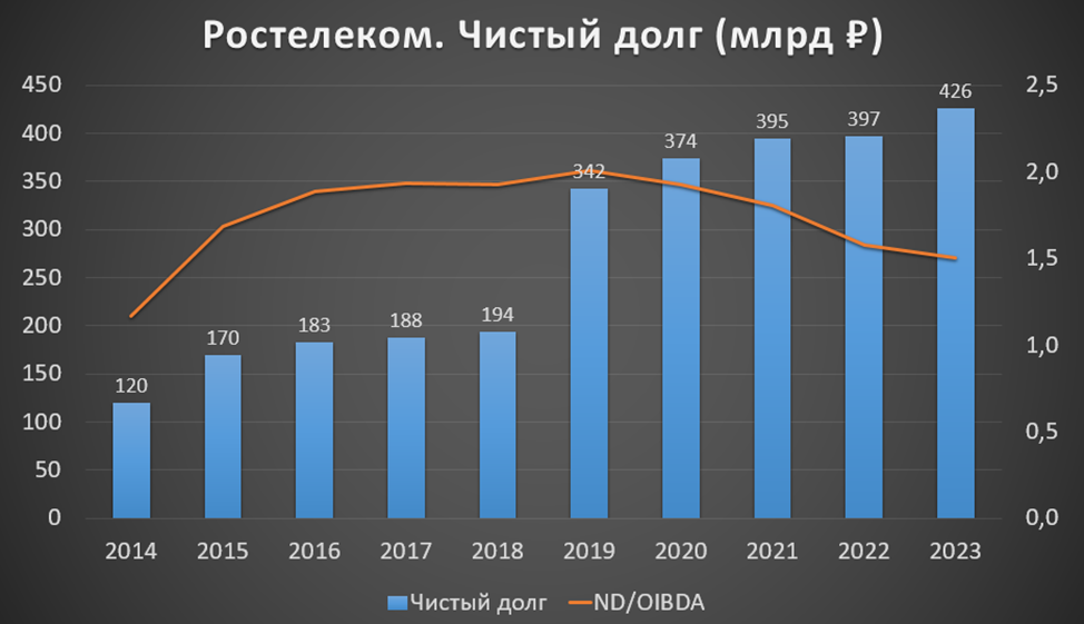 Также стоит отметить, что у компании довольно высокий долг. На его обслуживание компания тратит более 50 млрд в год. Еще Ростелеком выплатил разовый сбор со сверхдоходов за 2021-2022г. в размере 0,7 млрд.