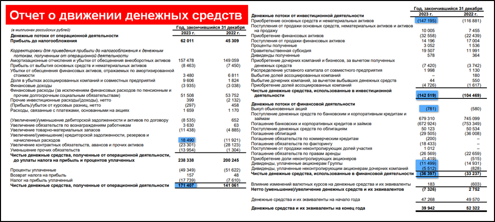 финансовая деятельность -36 млрд (+28% г/г). Из них 0,8 млрд ушло на выкуп своих акций.
