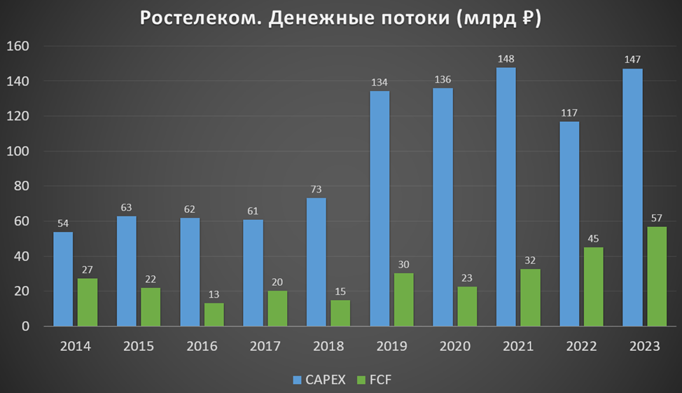 Капитальные затраты на высоких отметках, но свободный денежный поток также подрос до максимальных отметок 56,8 млрд (+26% г/г).