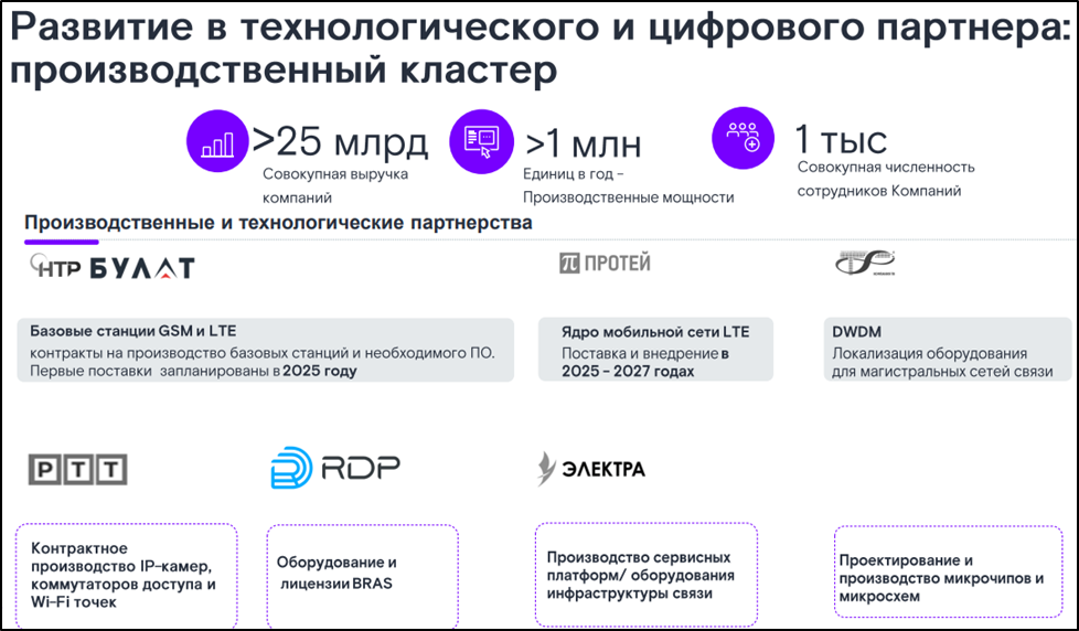 С другой стороны, уход иностранных поставщиков дал возможность Ростелекому начать производство отечественного телеком оборудования. Это очень перспективное направление. В частности, 13.02.24 стало известно, что компания «БУЛАТ» (дочерняя компания Ростелекома) получила положительные результаты тестирования прототипа отечественной базовой станции GSM/LTE.