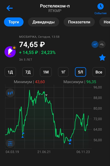 Последний раз я покупал привилегированные акции Ростелекома, т.к. у них выше дивидендная доходность. Позиция плюсует на 40%. Плюс получал дивиденды. Если цена вырастет выше 90₽, то возможно, начну фиксировать прибыль. А если снизится к 62₽, то вероятно, буду докупать.