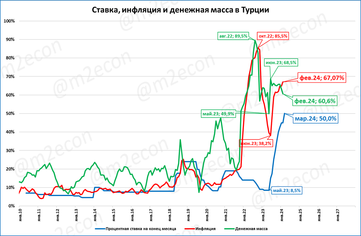 В Турции денежная масса в реальном выражении сжимается уже второй месяц подряд. Проблема: ЦБ повышает ставки нерешительно и к тому же тормозит рост денежной массы.