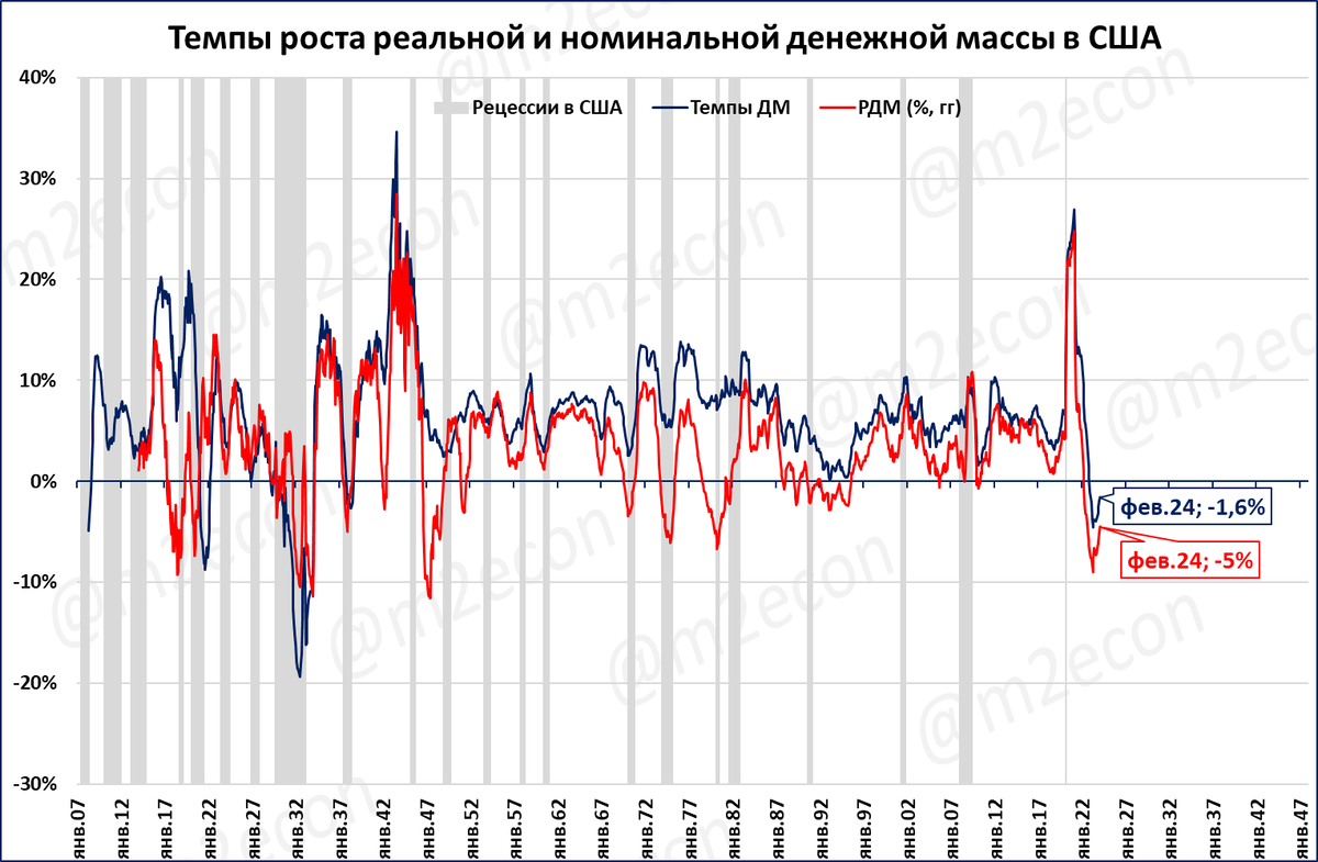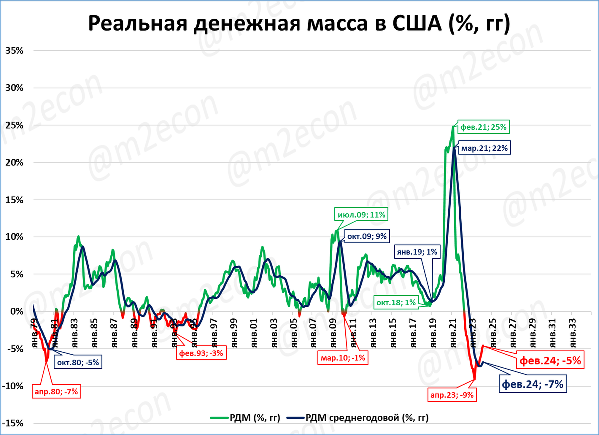 В США денежная масса продолжает сжиматься: -1,6% в феврале. С учётом инфляции 3,2% годовых, реальная денежная масса в феврале сжалась на 5%.