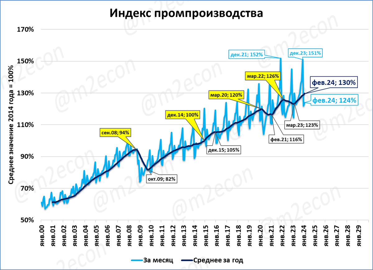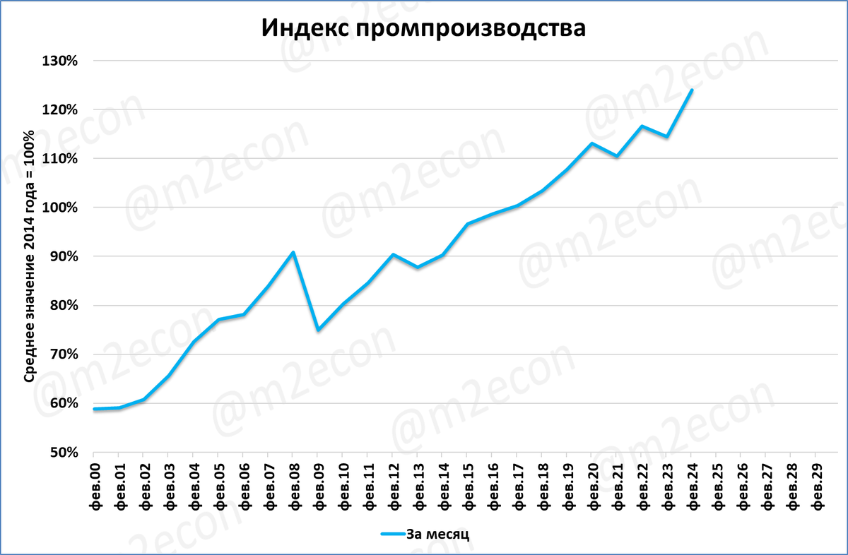 Индекс промпроизводства в феврале составил 124% к среднегодовому уровню 2014 года.