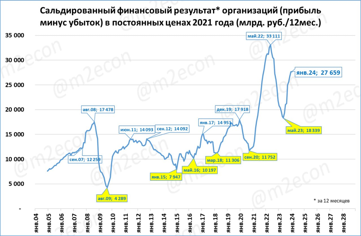 Реальная прибыль за 12 месяцев (скользящий год) остановилась на отметке 27,7 трлн рублей в ценах 2021 года, повторив результат месячной давности.