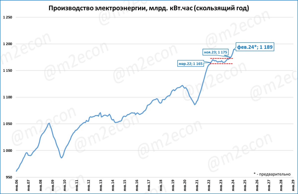 За последние 12 месяцев (скользящий год) 1 189 млрд. кВт-часов — исторический рекорд.