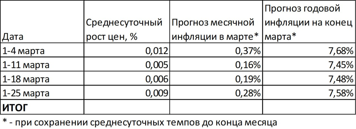 Если такой темп сохранится до конца месяца, то по итогам марта инфляция составит 7,6% годовых (7,7% по итогам февраля). Рост цен в марте при этом составит 0,28%.