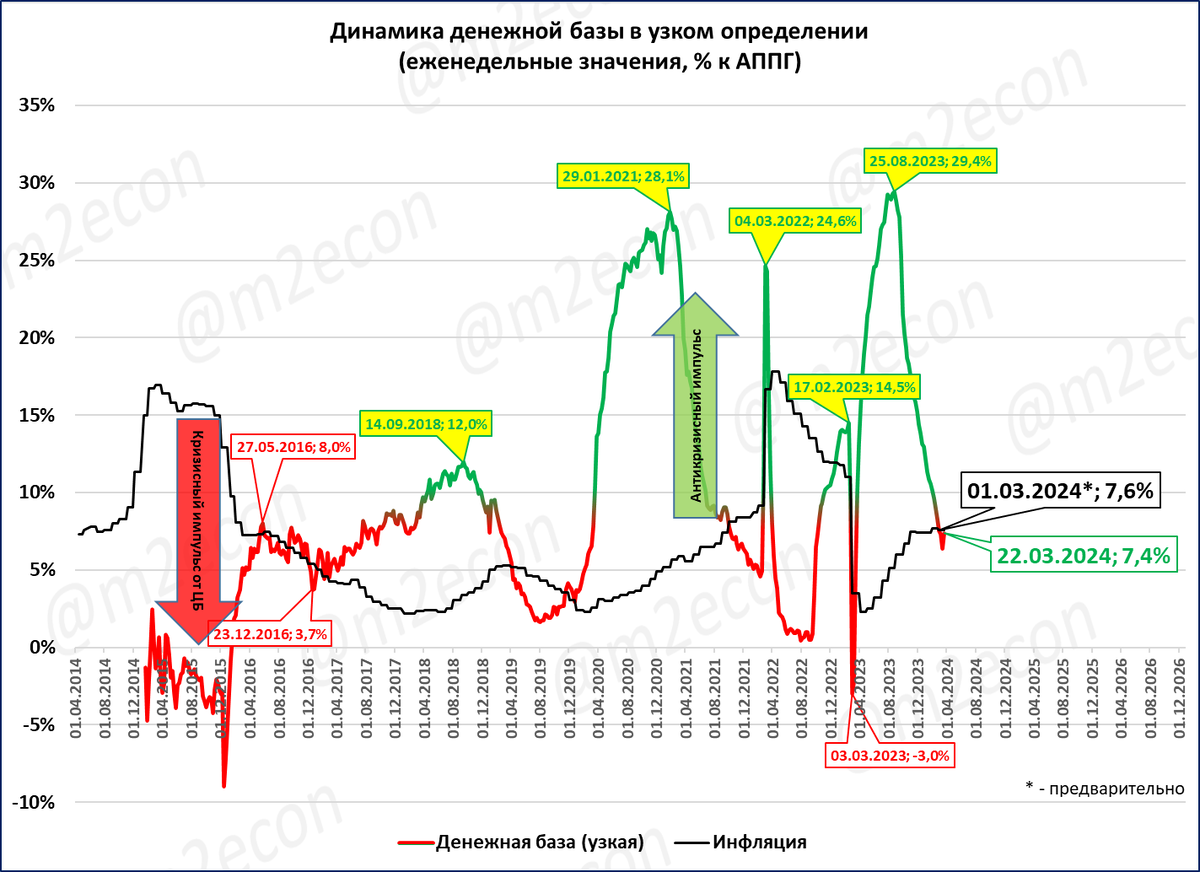 Узкая денежная база растёт медленнее цен (= сжимается в реальном выражении).