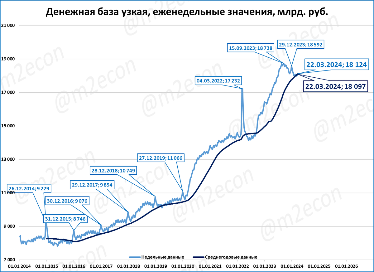 Как сообщает ЦБ, узкая денежная база на 22 марта составила 18,1 трлн рублей.