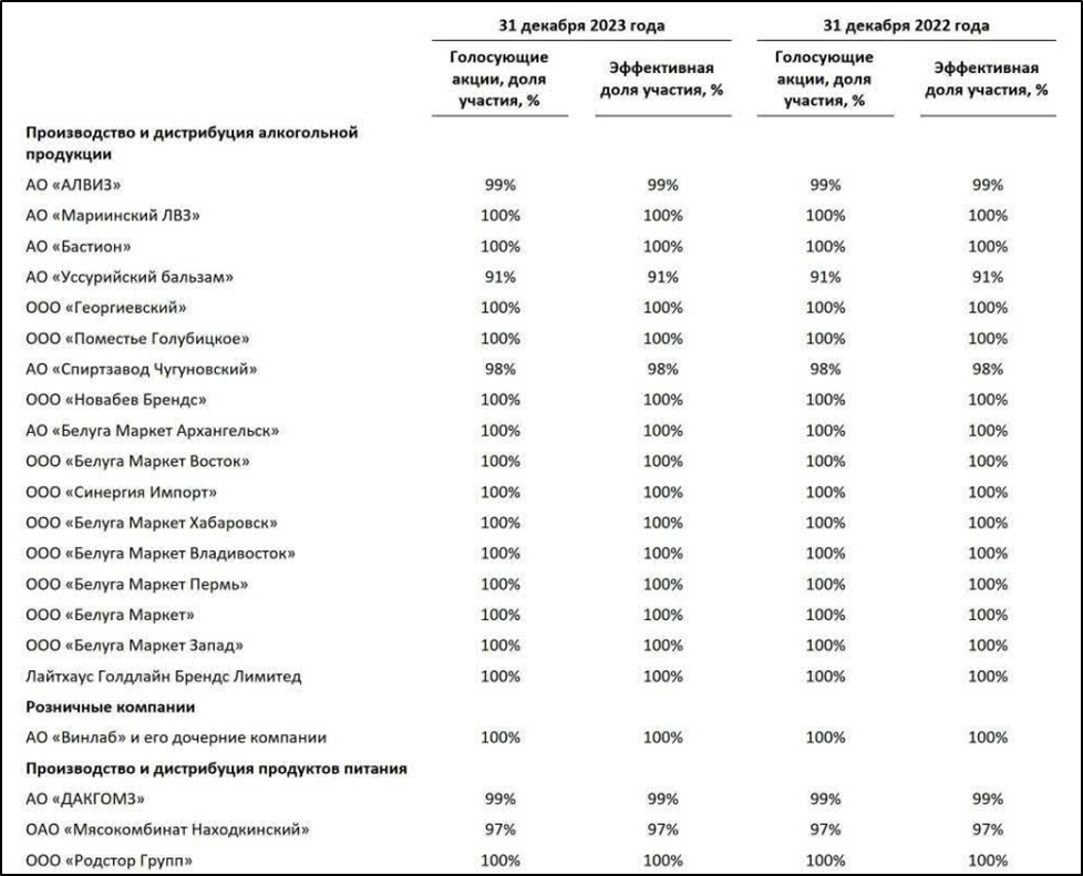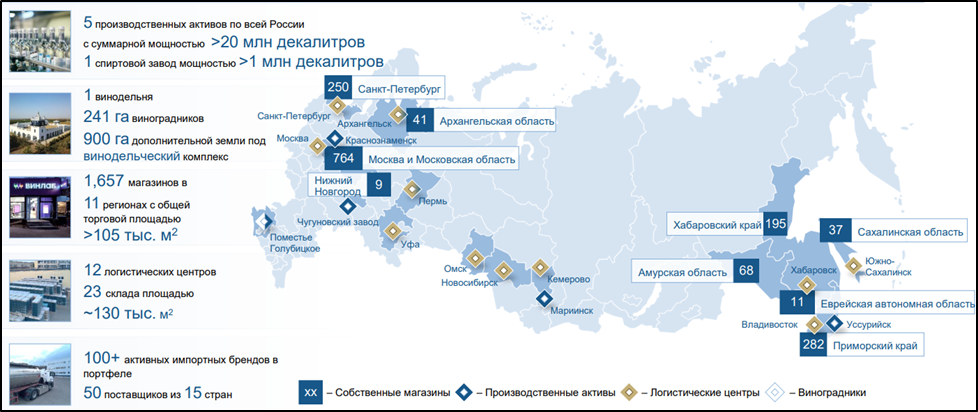 Группе принадлежат пять ликеро-водочных заводов, один спиртзавод, винное хозяйство, собственная система дистрибуции и сеть розничных магазинов «ВинЛаб». Количество сотрудников 13тыс чел.