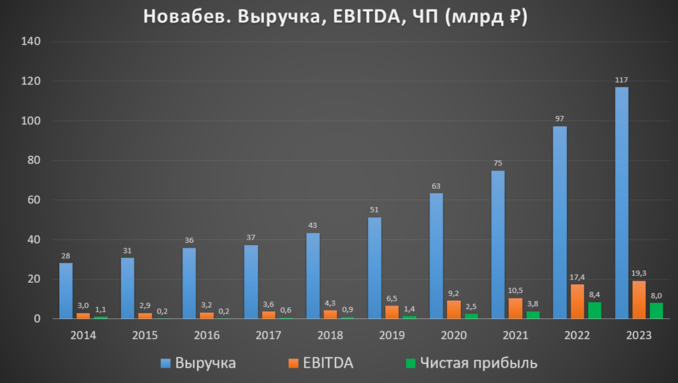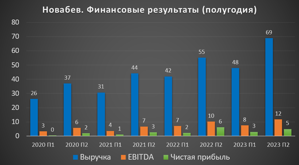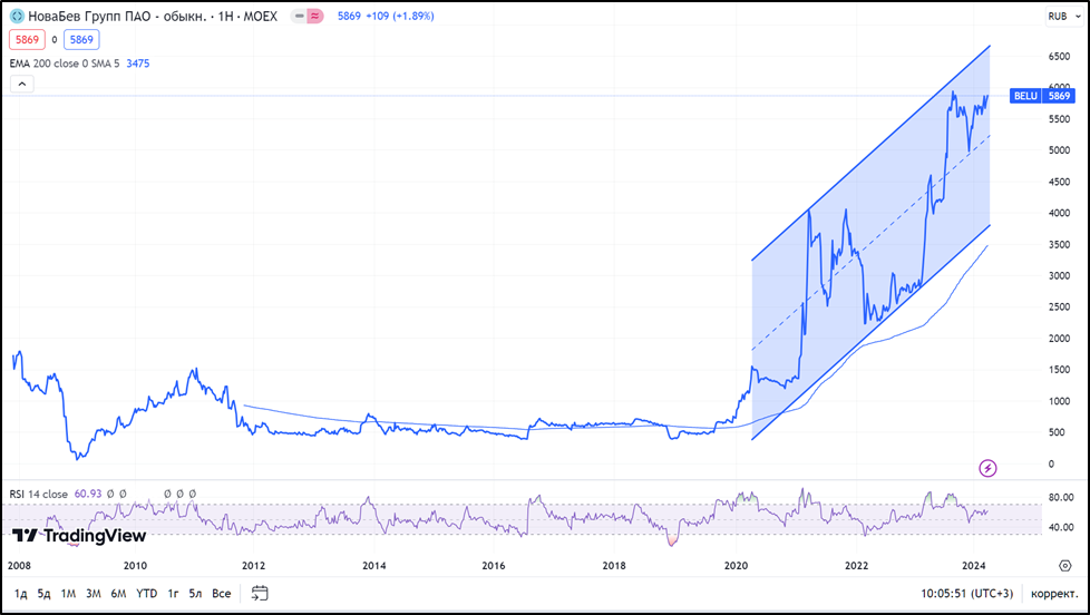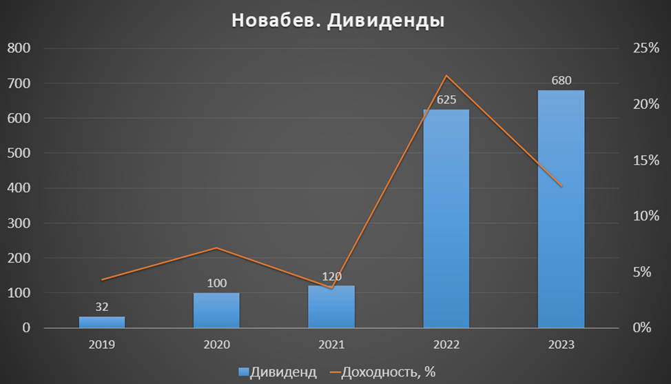 За последние 5 лет акции компании продемонстрировали впечатляющий рост. Котировки взлетели более, чем в 15 раз. За 2023 год акции Новабев выросли более, чем на 90%, т.е. динамика в 2 раза лучше, чем у индекса Мосбиржи. Плюс были выплачены дивиденды, суммарно около 16% к текущей цене. На данный момент график цены находится у верхней границы восходящего канала.