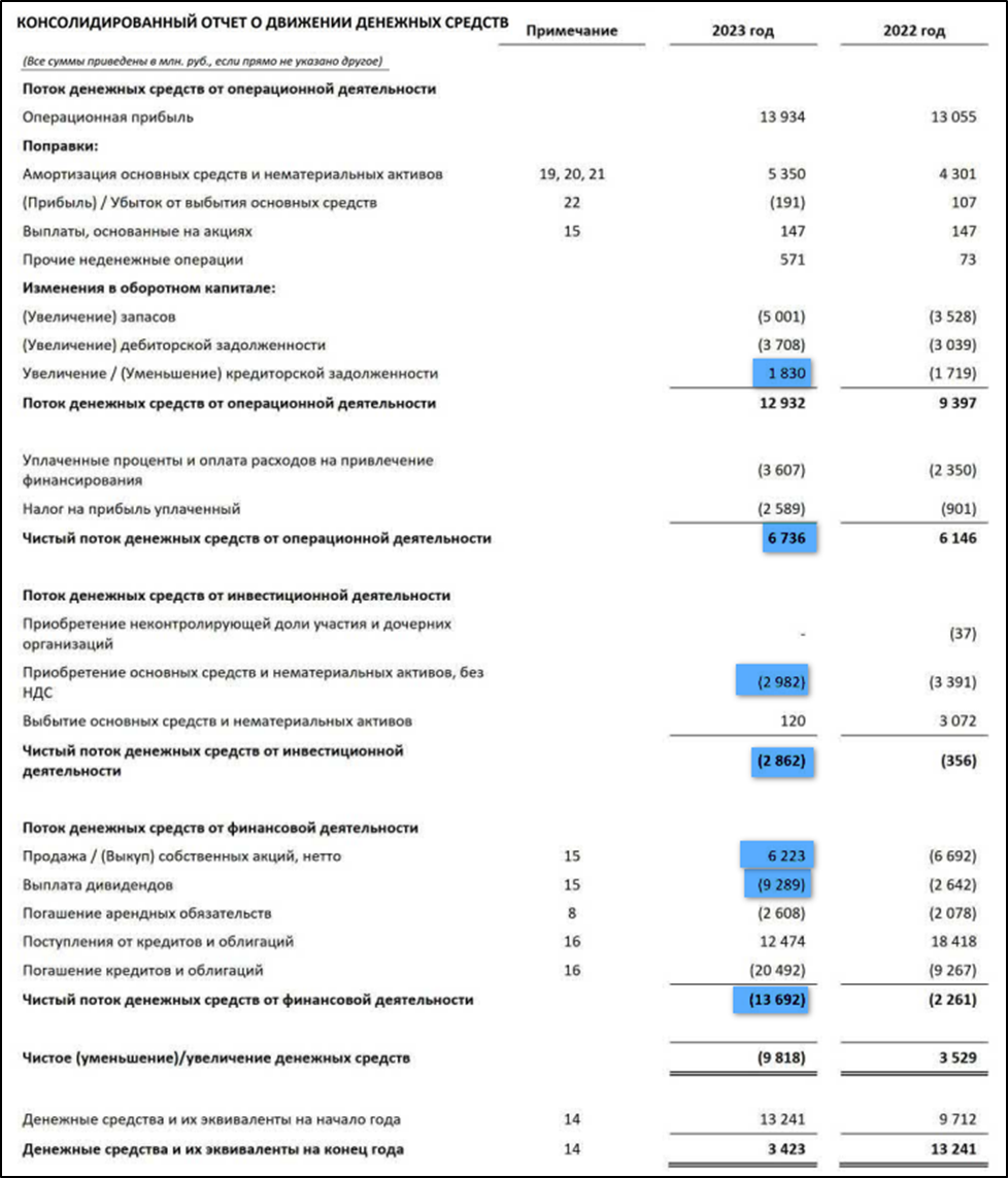 финансовая деятельность -13,7 млрд. Здесь основная статья — это выплата дивидендов на 9,2 млрд. И на 8 млрд был сокращён долг. Еще отметим, что Новабев продал часть акций из своего казначейского пакета на сумму 6,2 млрд. Это негативный сигнал.