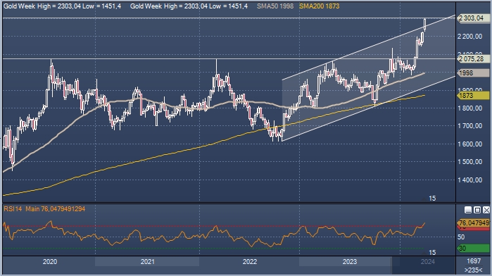 Накануне (3 апреля) стоимость золота впервые превысила 2300 долларов за унцию, продолжив свое недельное ралли. За последние 6 недель золото прибавило в цене 5 раз. Последние 3 недели, включая текущую, золото завершит в плюсе.