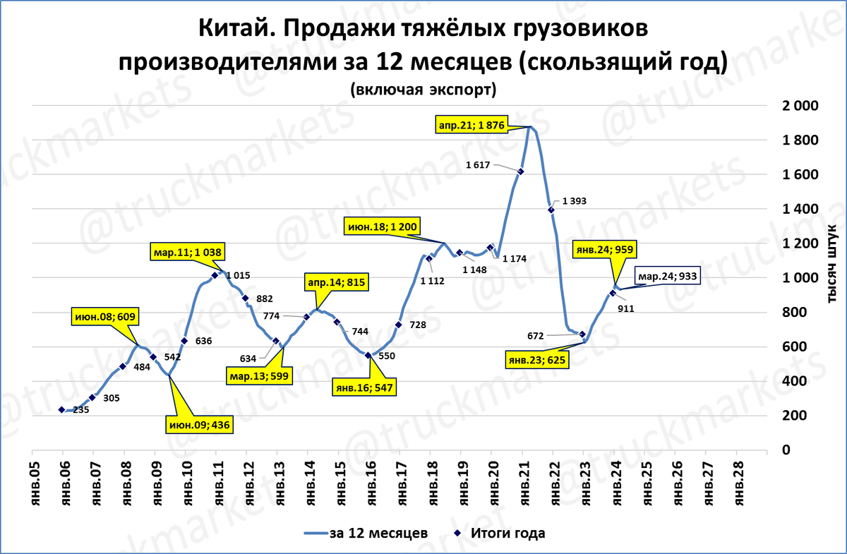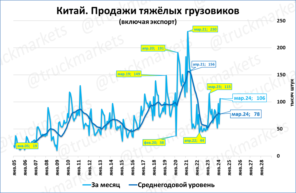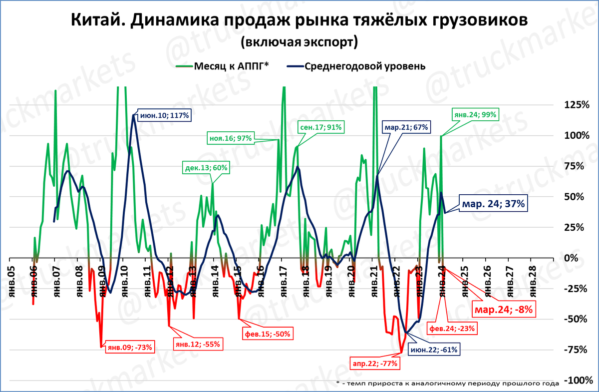 Продажи грузовиков китайскими производителями (экспорт+ внутренний рынок) падают второй месяц подряд. Падение в марте составило -8%.