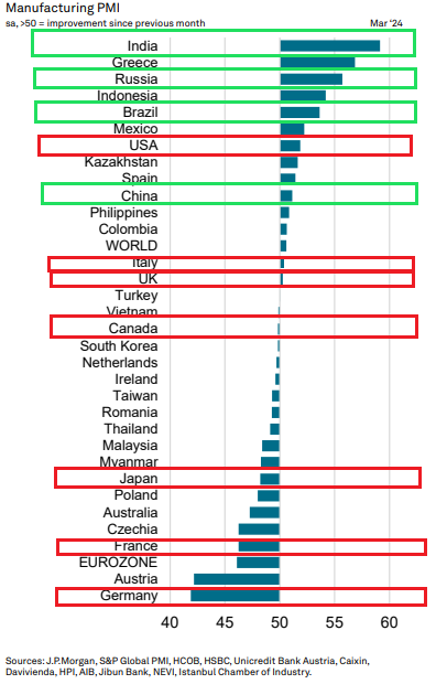 Отдельно можно выделить заметный скачок Британии - в марте она вышла из зоны спада и перешла в позитивную, "зеленую" зону.