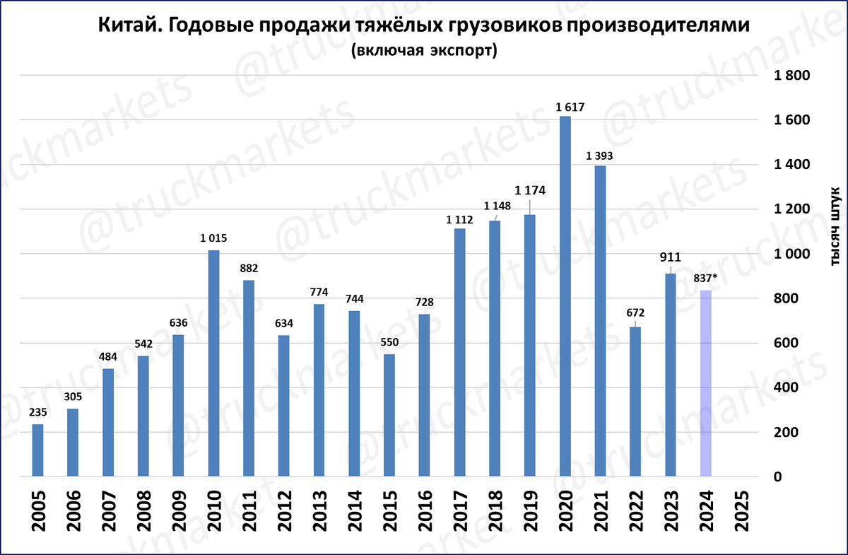 Продажи грузовиков производителями Китая в марте: 106 тыс. (-8%)