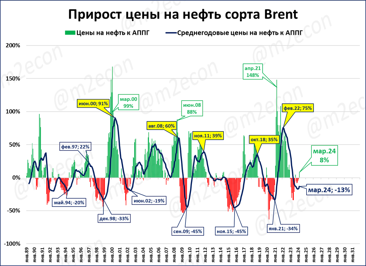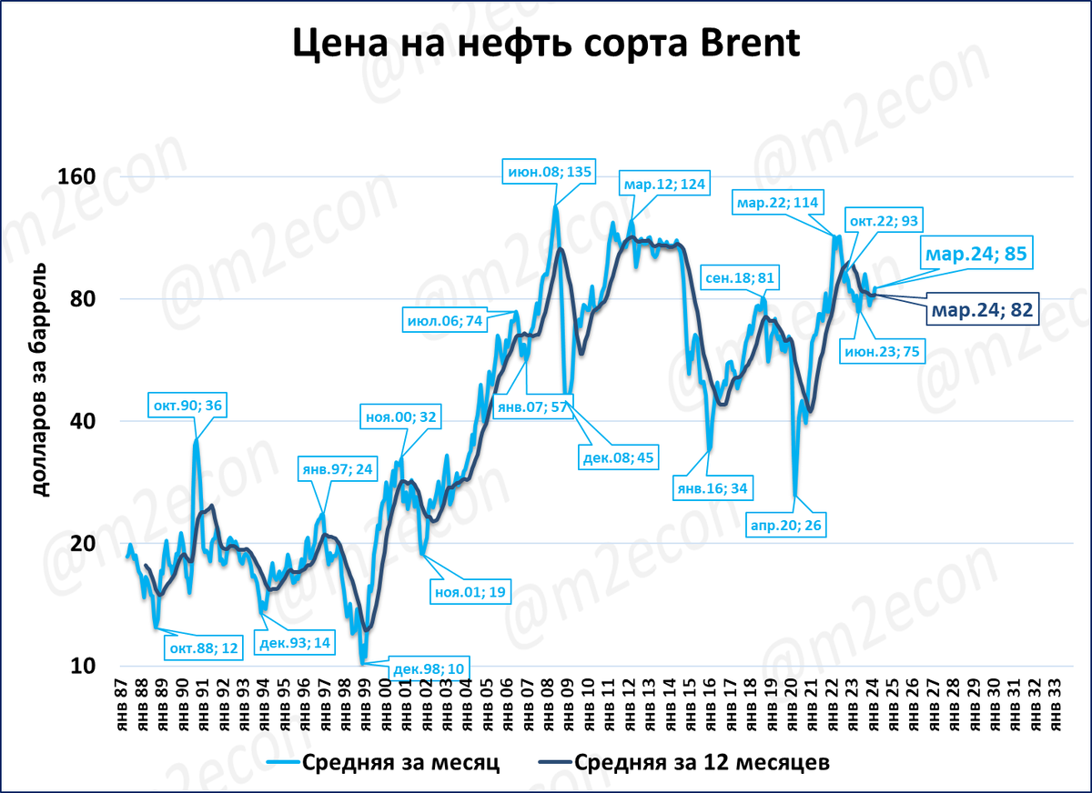 Цена нефти сорта Брент уже больше года (с октября 2022) находится в диапазоне от 75 до 92 долларов за баррель. В марте цена составила 85 долларов за баррель.