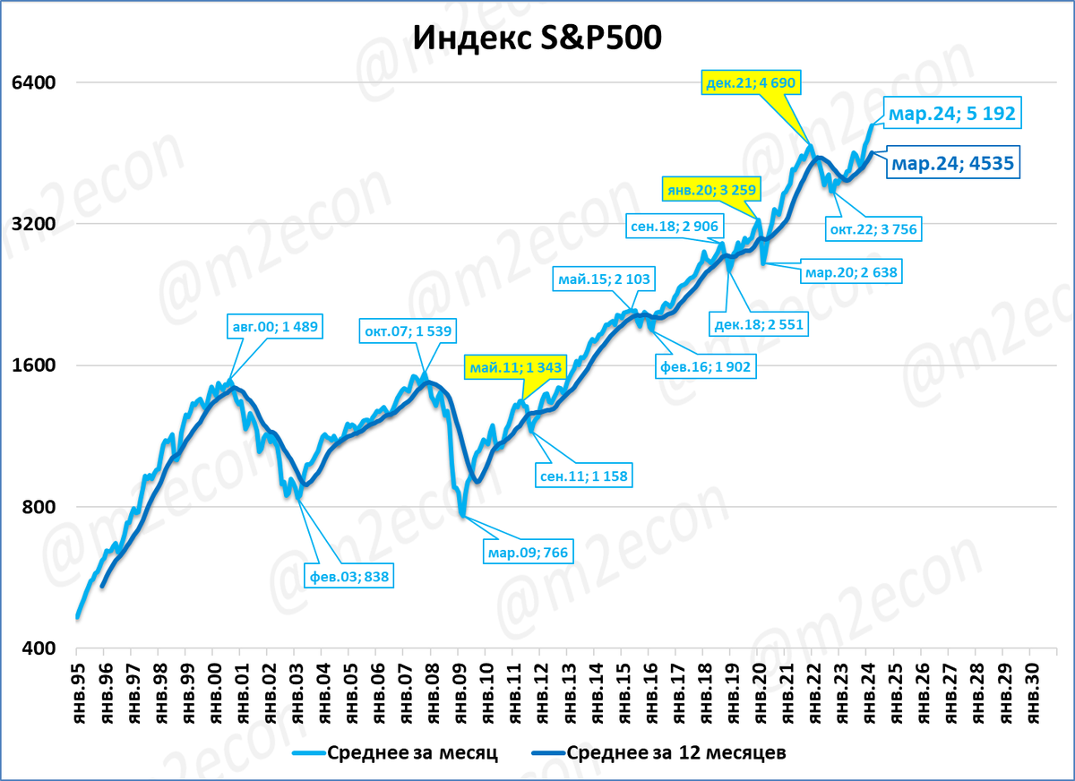В марте среднее значение американского фондового индекса S&P 500 составило 5 192 пункта. Это рекордное значение за всю историю.