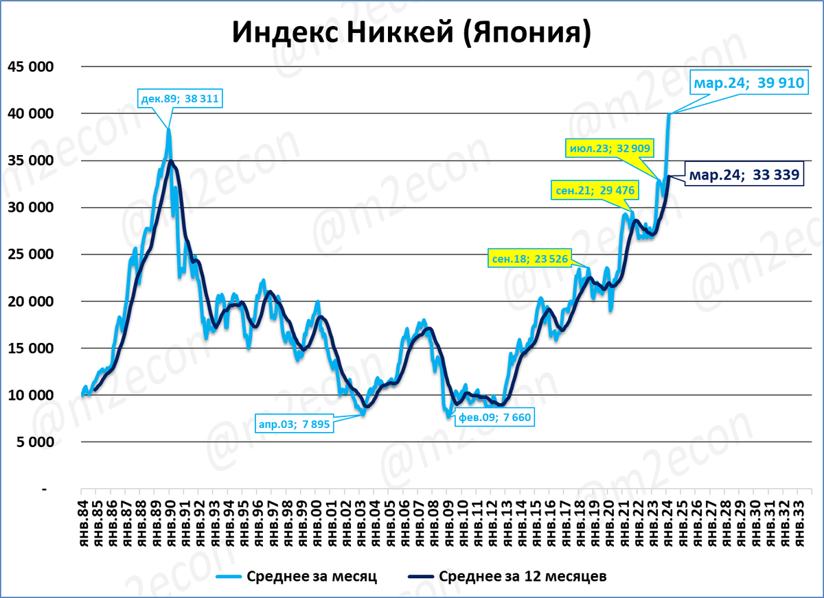 Японский фондовый индекс Никкей в марте показал очередной многолетний максимум. Он достиг 39 910 пунктов, что является лучшим результатом за всю историю.