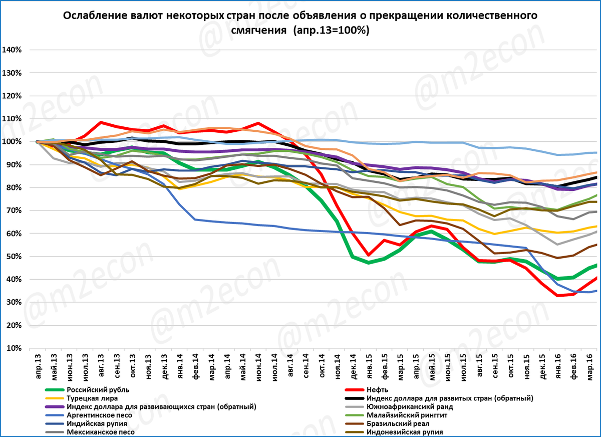 Когда ФРС весной 2013 года объявила о предстоящем в 2014 году сворачивании количественного смягчения, валюты развивающихся стран отреагировали на это снижением.