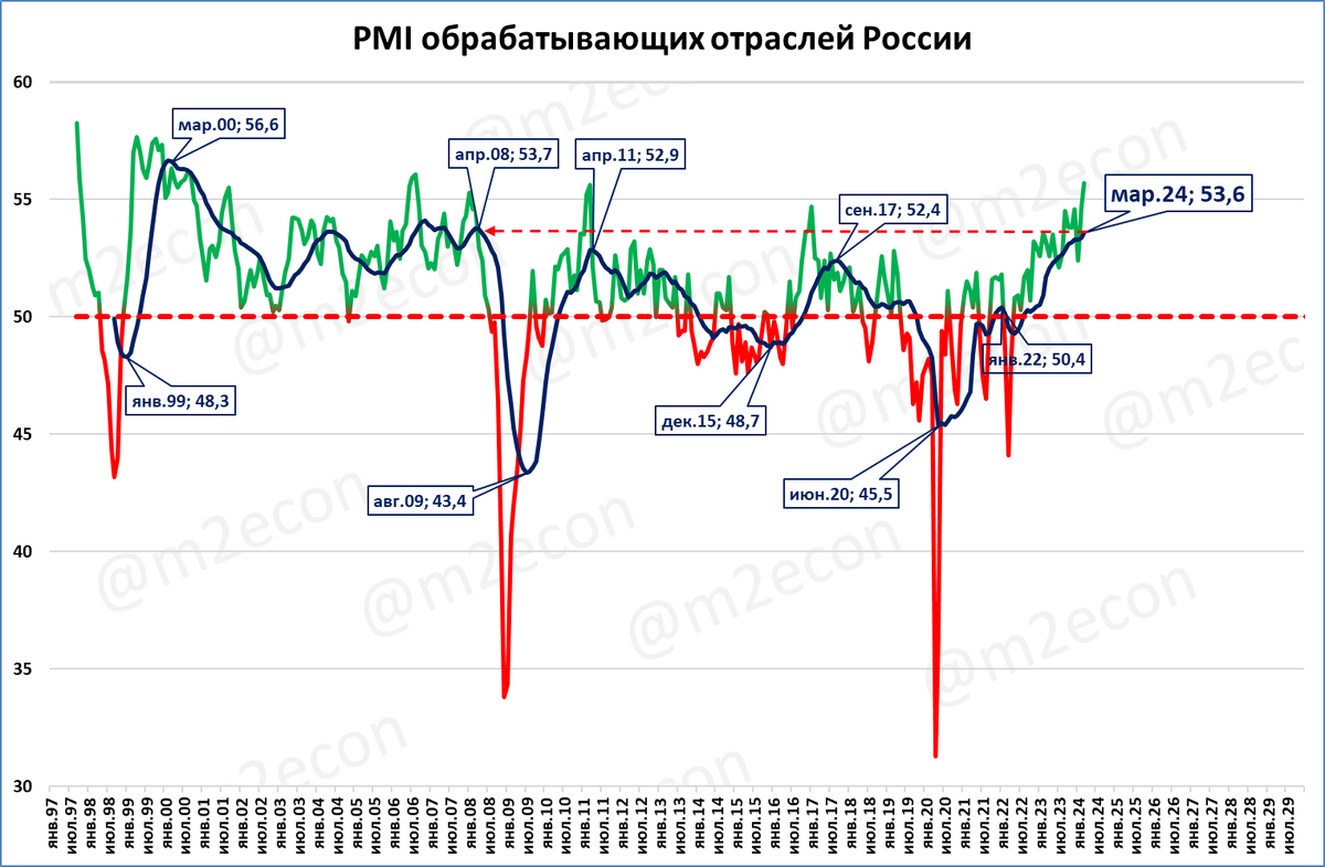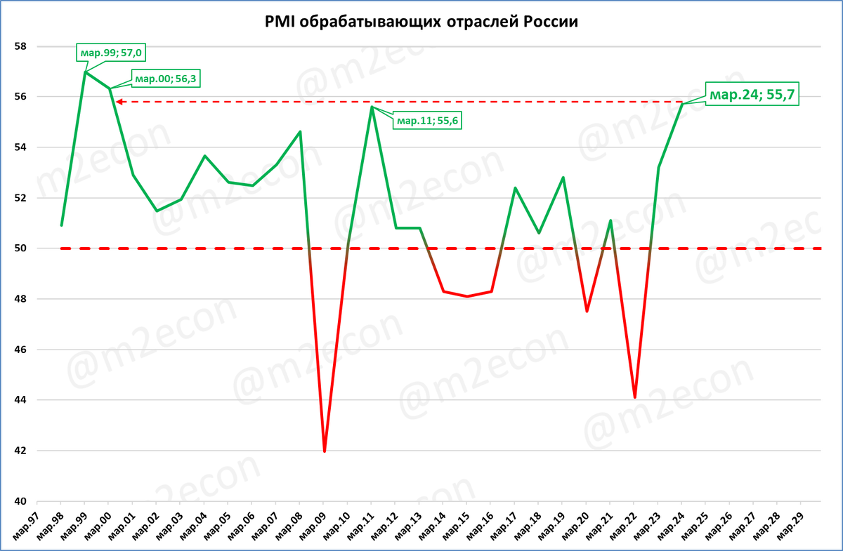 Только в марте 2000 (56,32) и марте 1999 (56,98) индекс был выше, чем в марте 2024 (55,7).