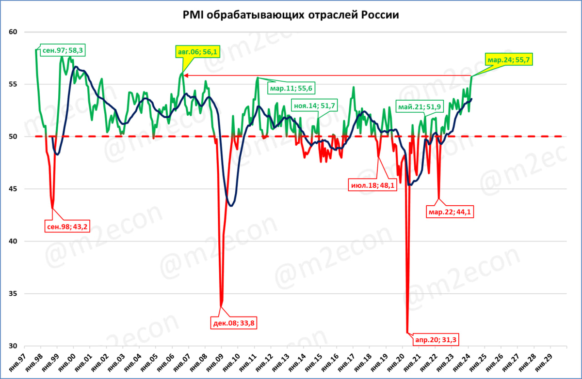 Индекс деловой активности в промышленности России (PMI manufacturing) от S&P Global в марте ставит новые 18-летние (с 2006 года) рекорды: 55,7 пункта.