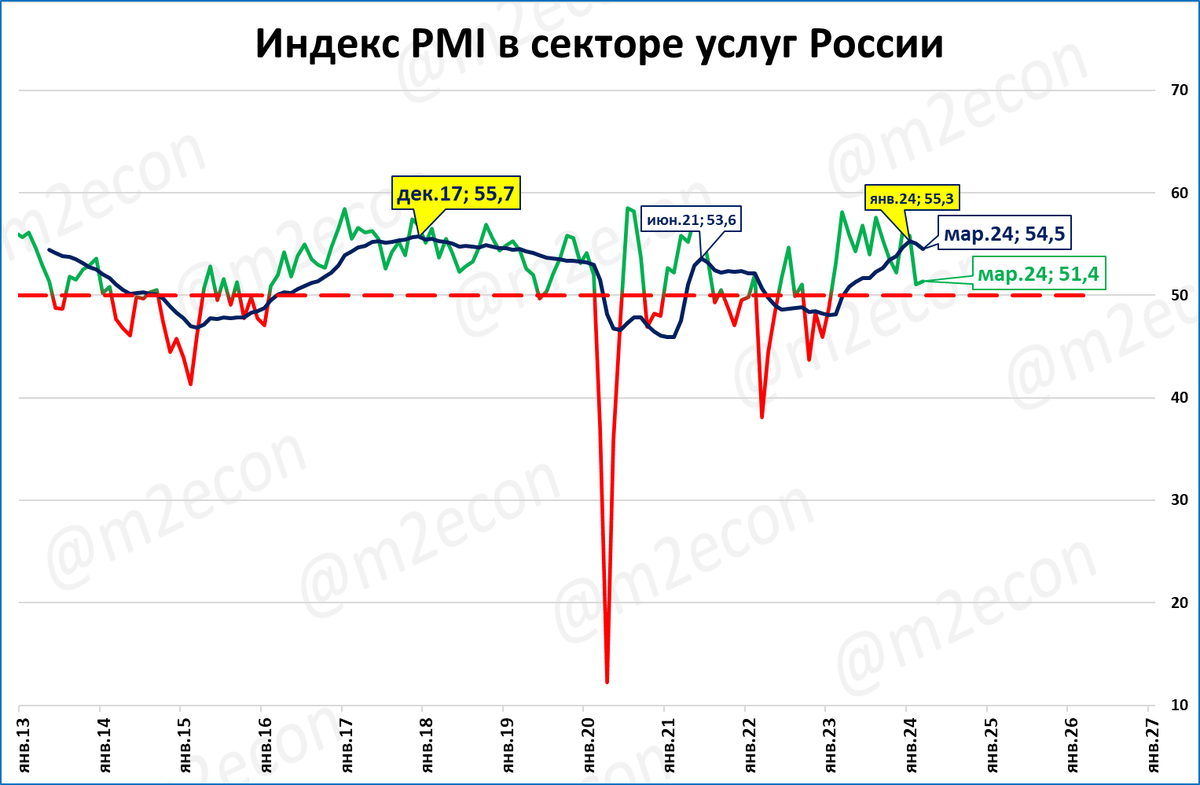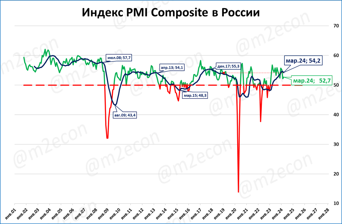 Композитный индекс PMI (промышленность + услуги) в марте составил 52,7 пункта. Это говорит о росте деловой активности в экономике России в целом.