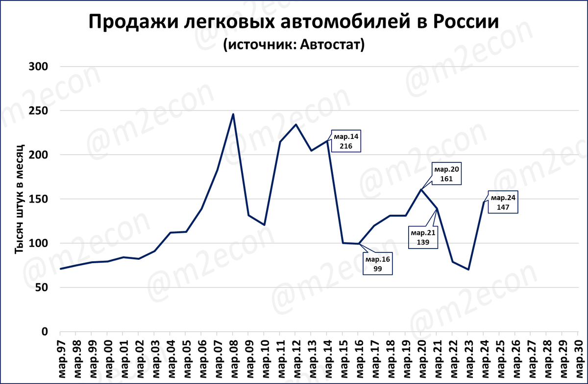 По данным агентства “Автостат” в марте было зарегистрировано 146 526 легковых автомобилей – лучший месяц с апреля 2021 года.