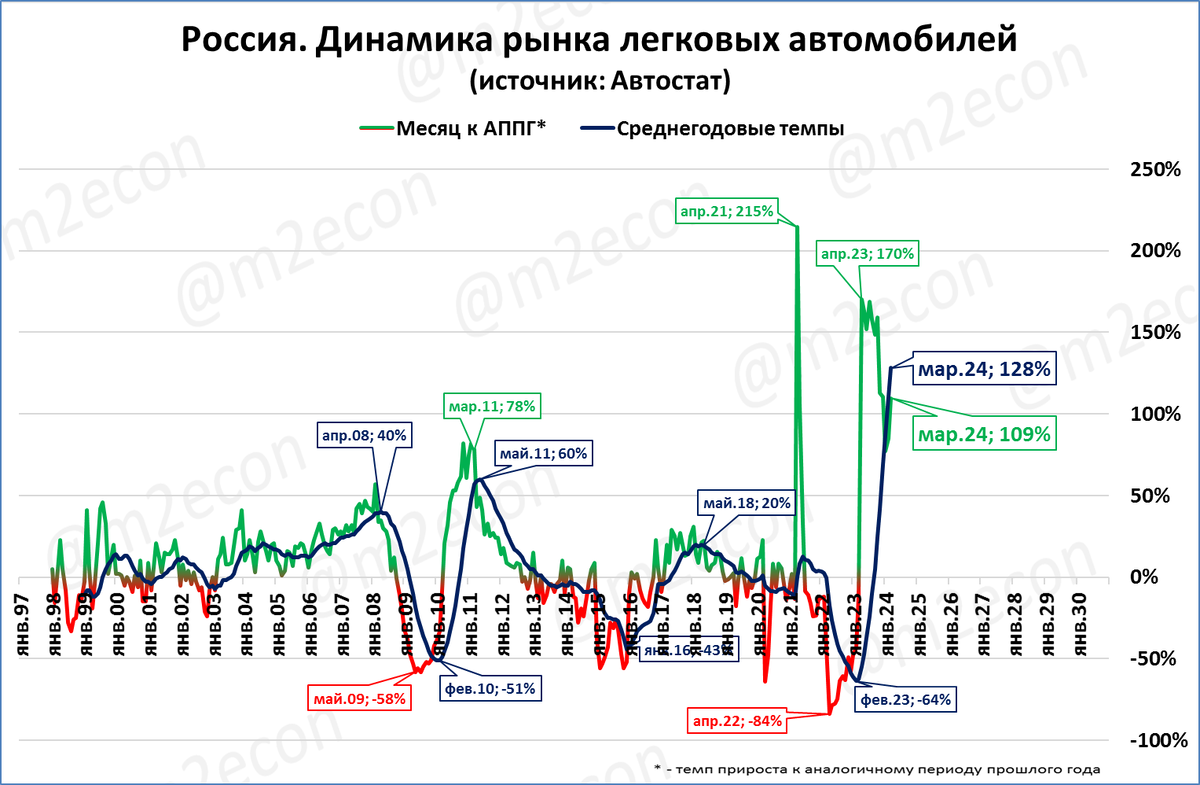 Рынок легковых автомобилей в марте летит в космос, темпы стали трёхзначными (+109%). Наш прогноз (1,5 млн. в 2024 году) может быть пересмотрен в сторону повышения.