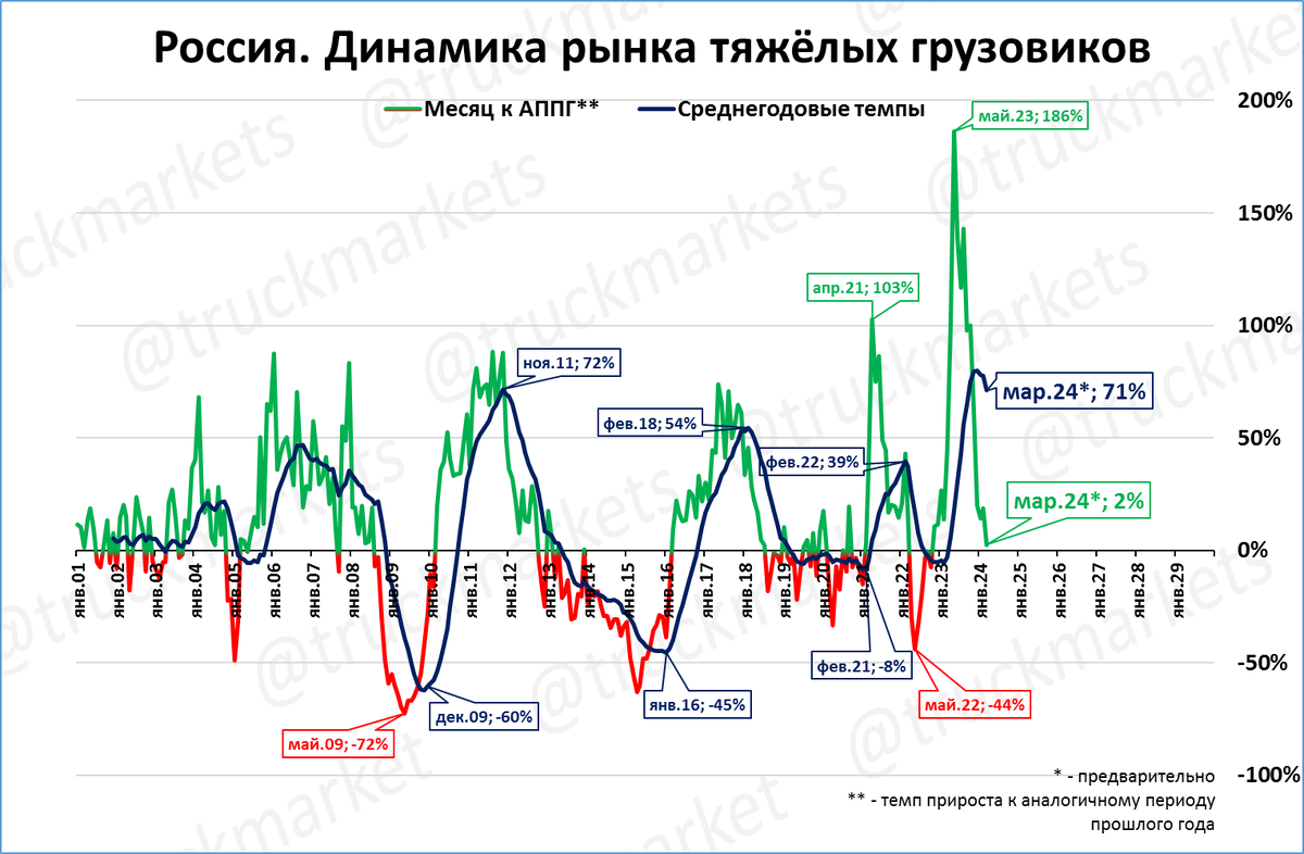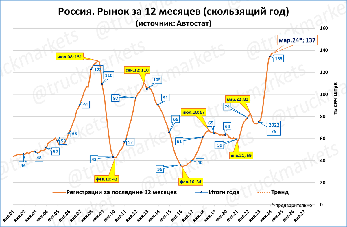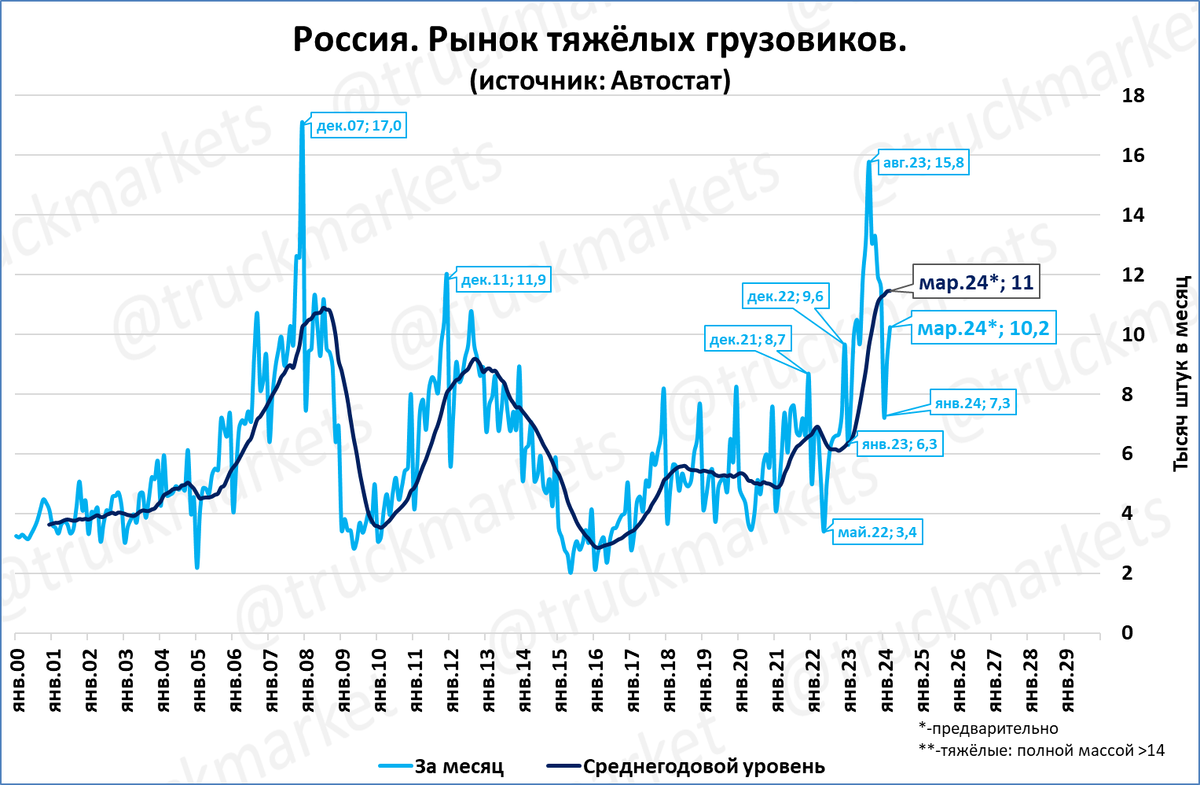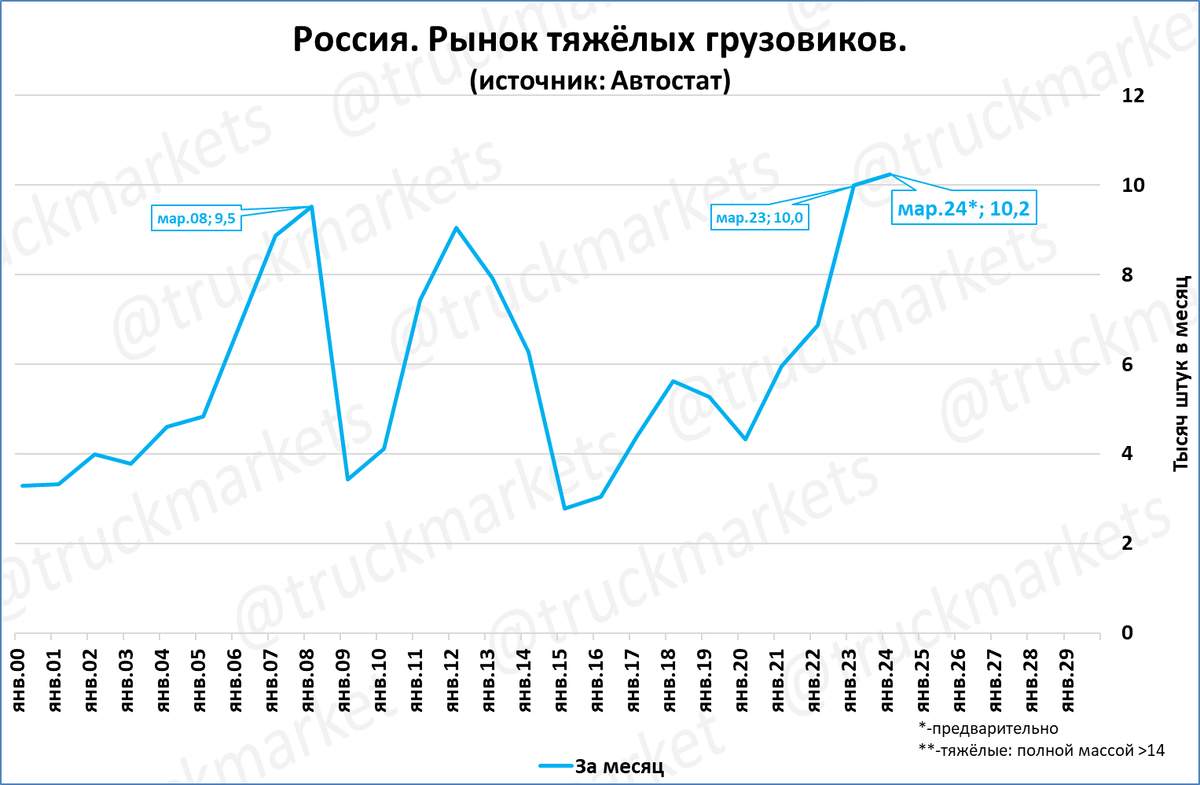 Рынок грузовиков в марте 10,2 тысяч. Это лучший март с 2000 года, но темпы роста слабые (+2%). 12-месячные продажи стабилизировались на уровне 137 тыс.