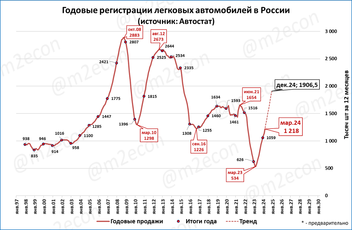 За последние 12 месяцев (скользящий год) рынок составил 1 218 тыс. автомобилей.