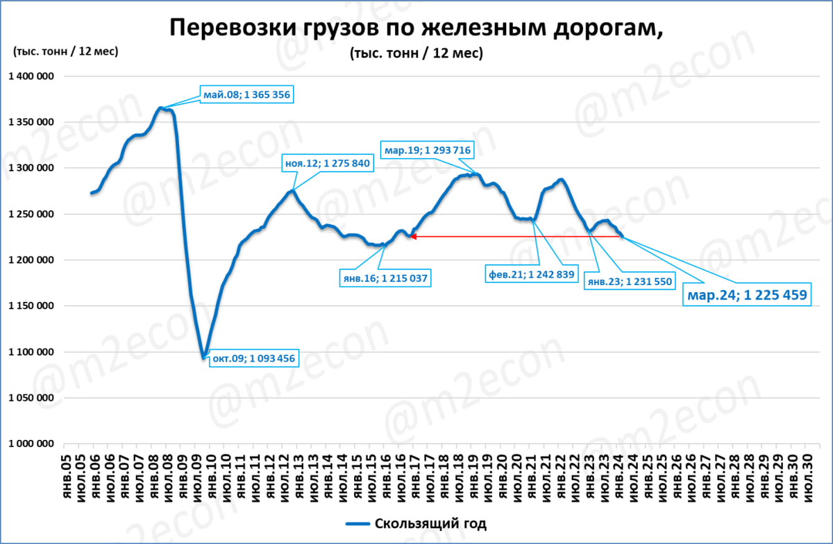 Перевозки за последние 12 месяцев (скользящий год) составили 1 млрд 225 млн тонн.