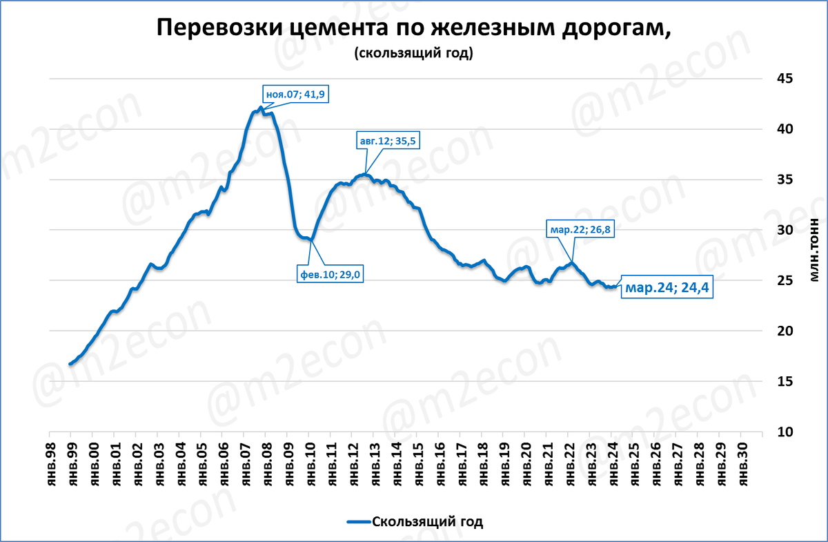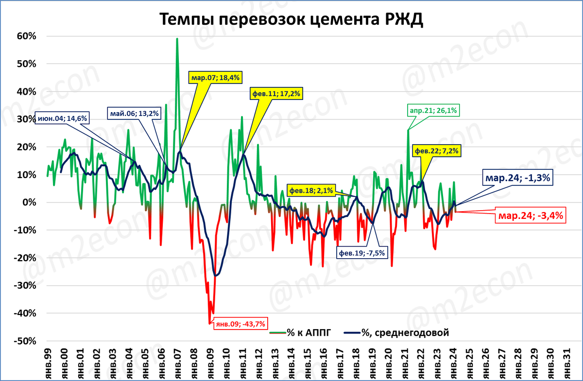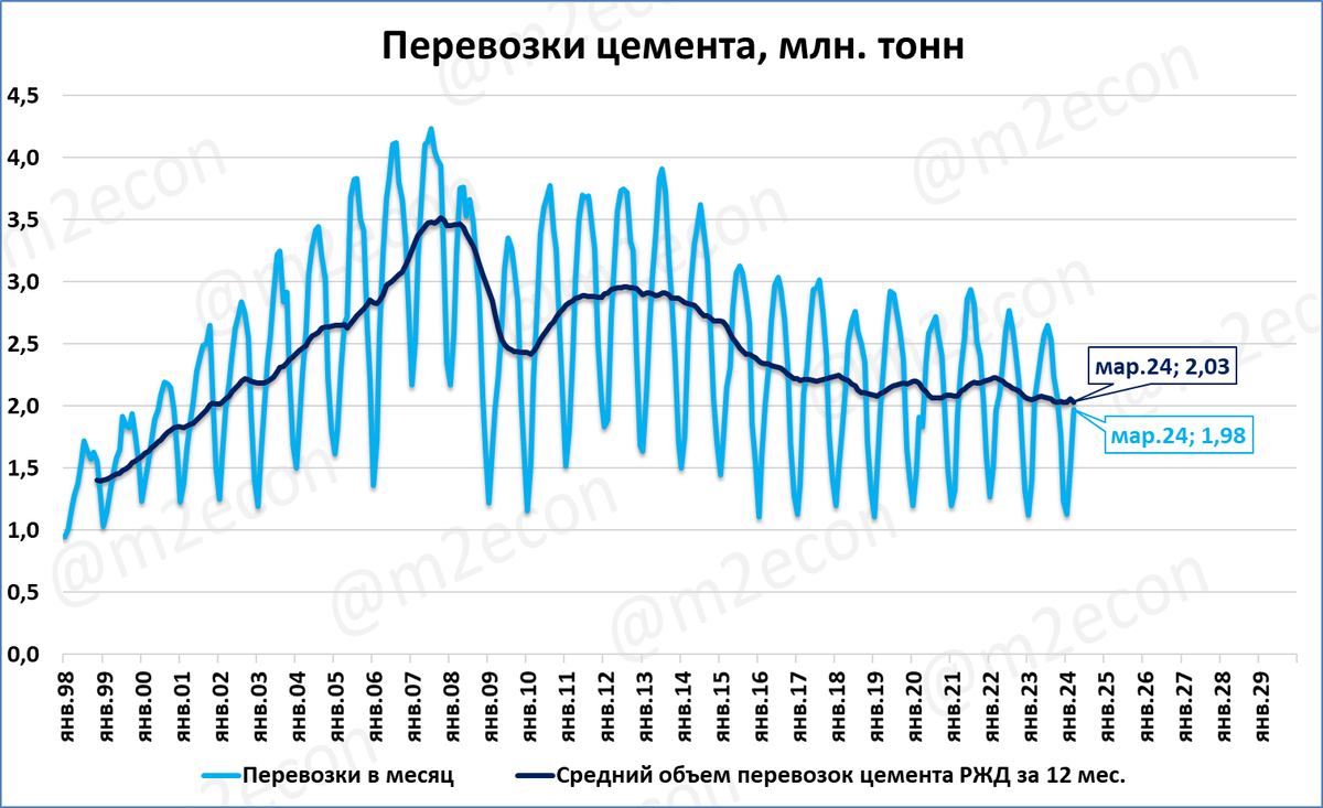 Перевозки грузов по железным дорогам в марте показывают отрицательную динамику как в целом (-3,5%), так и по перевозкам цемента в частности (-3,4%). С учётом дополнительного дня в феврале фактическое падение ещё более сильное.