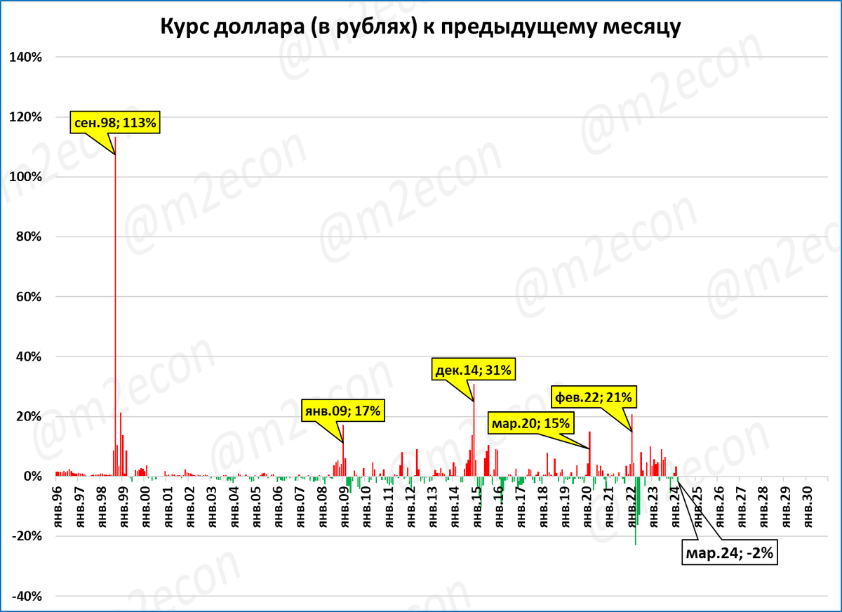 Резкие скачки курса (>15% к предыдущему месяцу) показаны жёлтыми выносками.