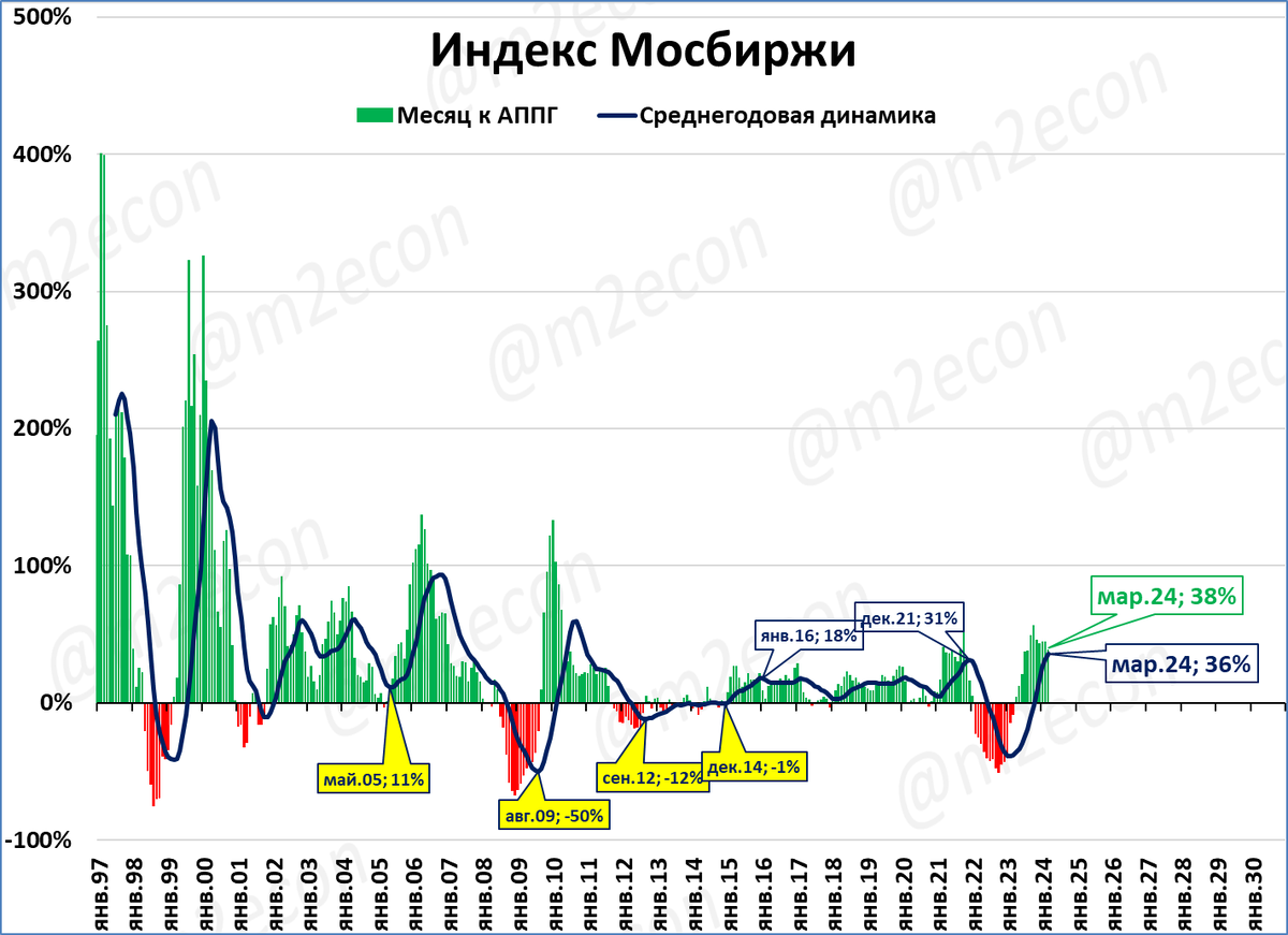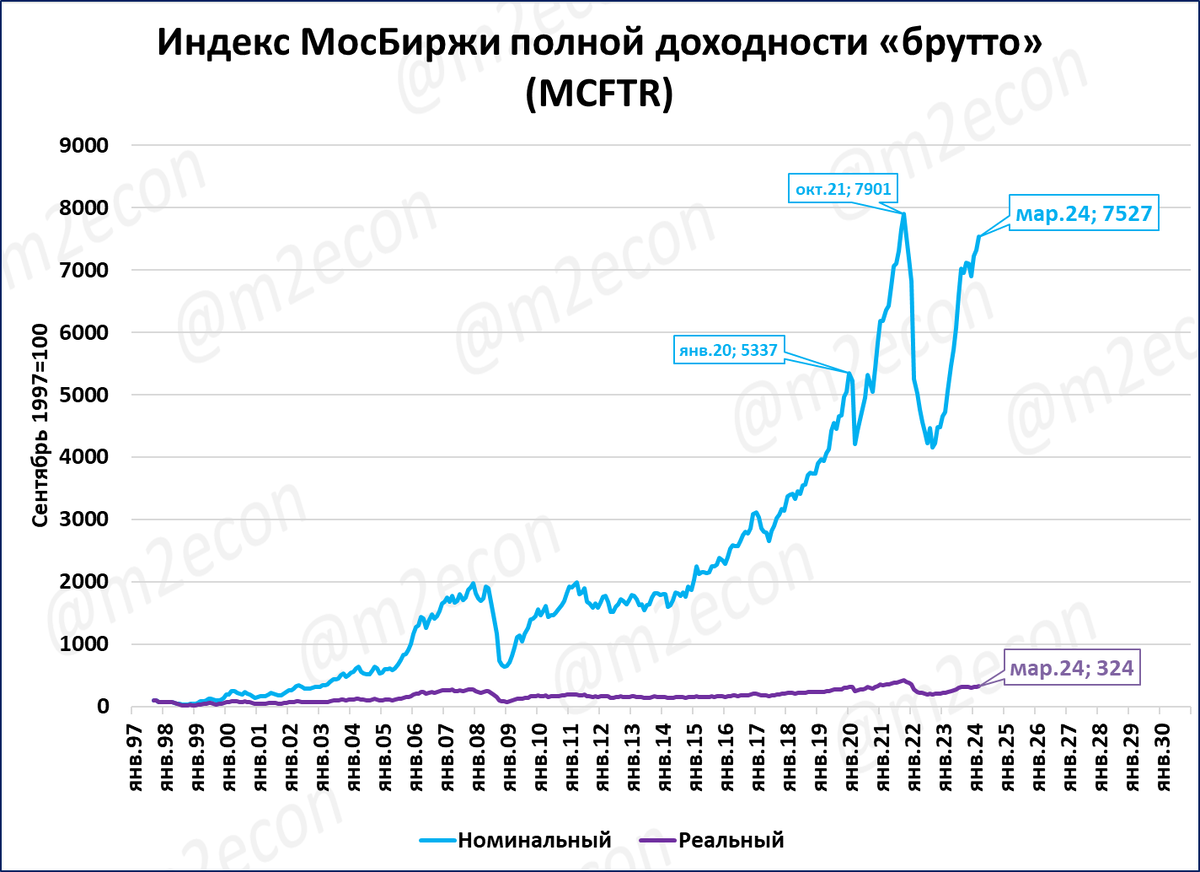 Индекс полной доходности учитывает выплаты дивидендов. По итогам марта 2024 года индекс вырос в 75 раз с сентября 1997 года (со 100 до 7527 пунктов; голубая линия на графике).
