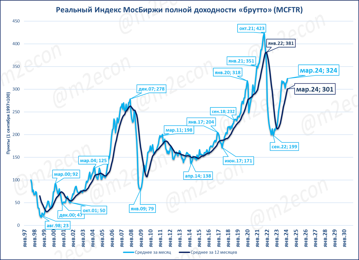 Реальный индекс полной доходности показал локальный минимум в сентябре 2022 года (199 пунктов) и вырос с тех пор в полтора раза, до 324 пунктов.