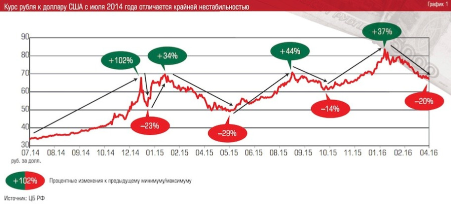Рис. 5. Курс рубля в 2014-2016 отличался крайней нестабильностью