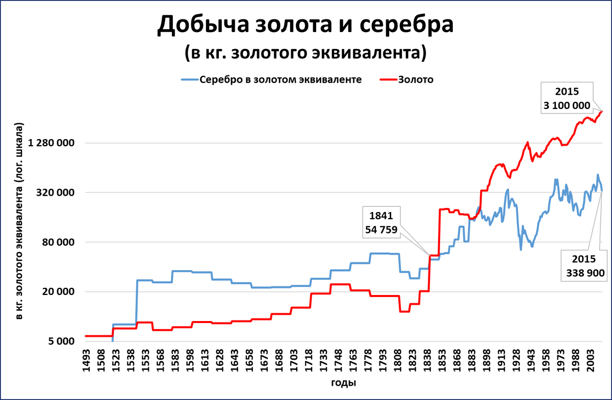 В 1841-1850 годах золота добывали уже на 36,4 млн долларов, а серебра уже меньше на 32,7 млн. В дальнейшем отрыв добычи золота от серебра в стоимостной оценке только увеличивался. В 2015 году золота в мире добывалось на порядок больше в стоимостном выражении, чем серебра.