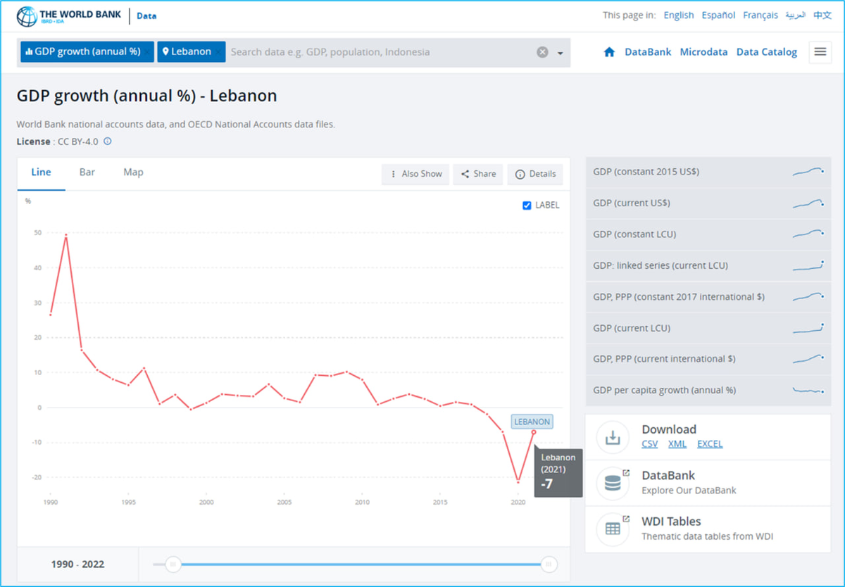 Официальные данные Всемирного банка доступны только по 2021 год включительно. Они подтверждают падение ВВП Ливана.